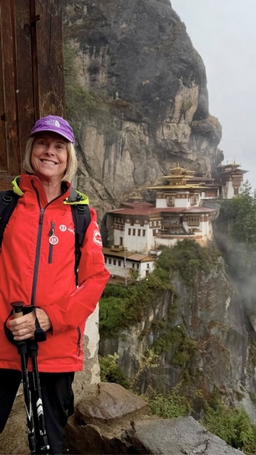 Unfortunately, unseasonable heavy rain-soaked Bhutan on our hiking day. Despite this, half our group attempted the climb, and four of us reached the summit. The trail begins at 8,530 feet and ascends 1,500 feet over more than a thousand stone steps. Throughout the climb, views of the monastery clinging impossibly to the cliff take your breath away—both literally and figuratively.